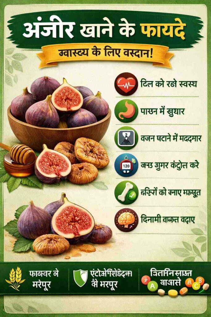 - Pachan (Digestion) Mein Sudhaar: Anjeer mein high fiber hota hai jo kabz (constipation) ki samasya ko jad se khatam karta hai. Rozana bheege huye anjeer khane se pet saaf rehta hai.